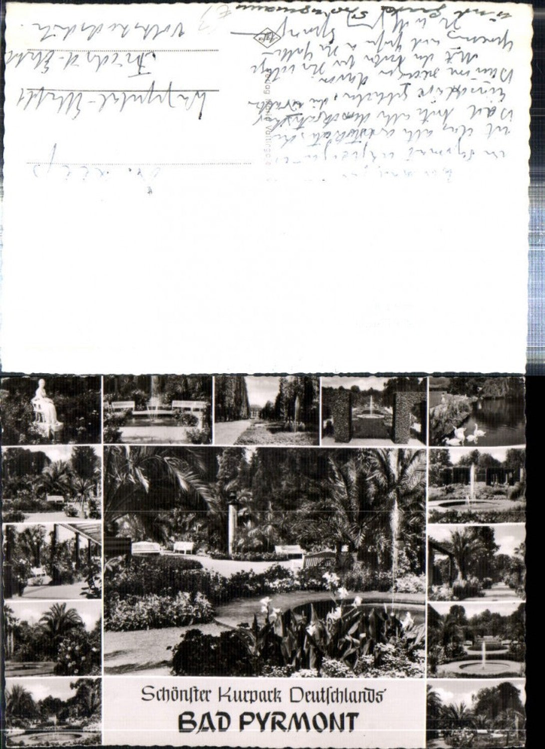 308196,Bad Pyrmont Kurpark Palmen Springbrunnen Statue Schwäne Mehrbildkarte