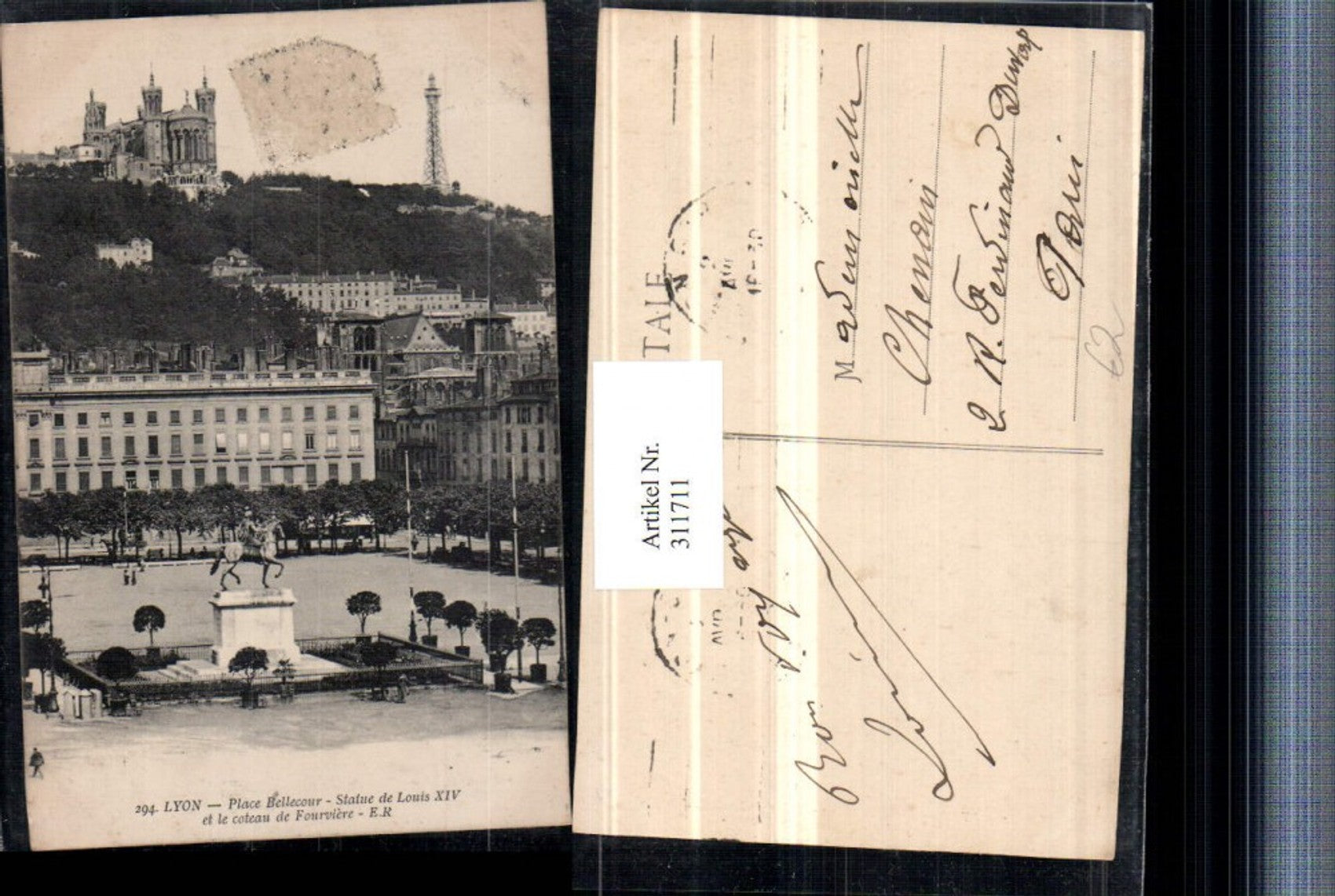 311711,Lyon Place Bellecour Statue de Louis XIV et le coteau de Fourviere Denkmal Kirche