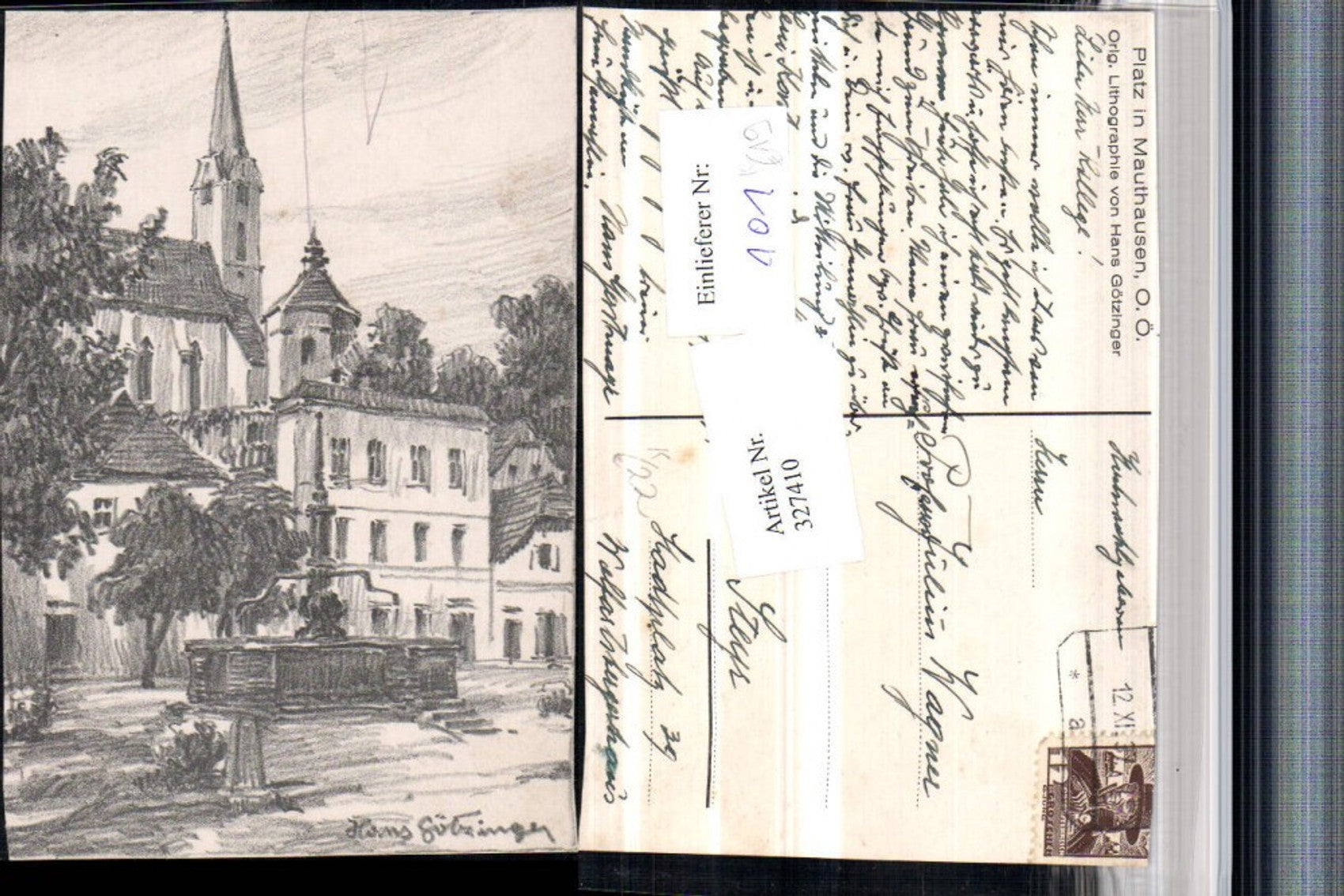 327410,Künstler AK Hans Götzinger Platz in Mauthausen Brunnen Kirche