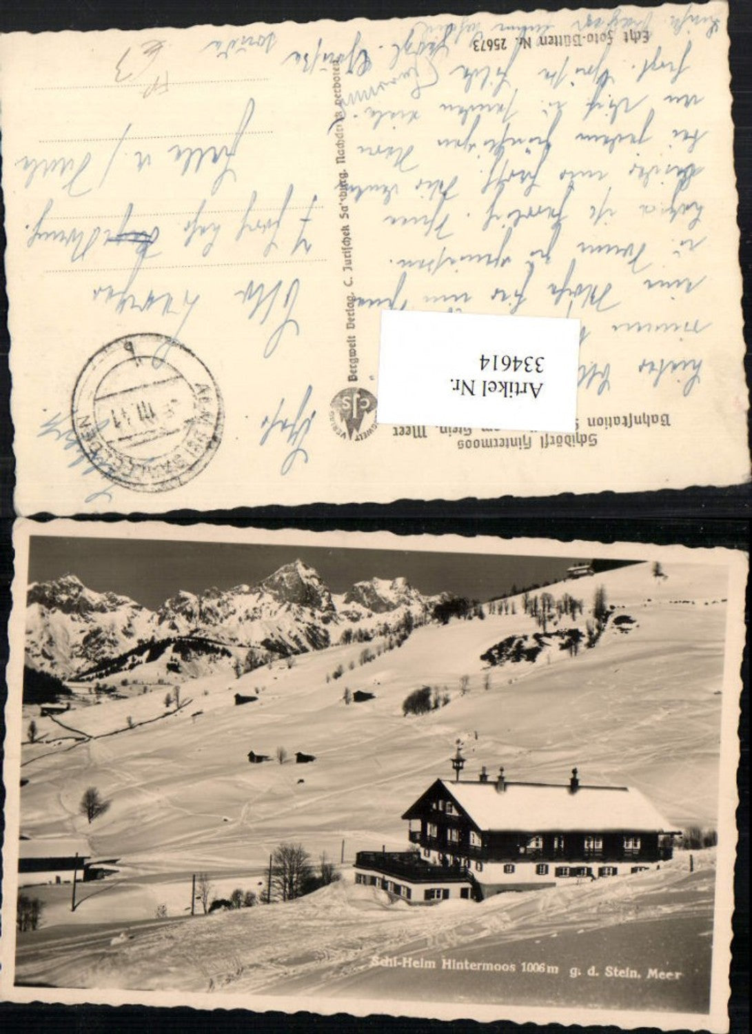 334614,Skiheim Hintermoos b. Saalfelden geg. Steinerne Meer Bergkulisse Winterbild Feldpost