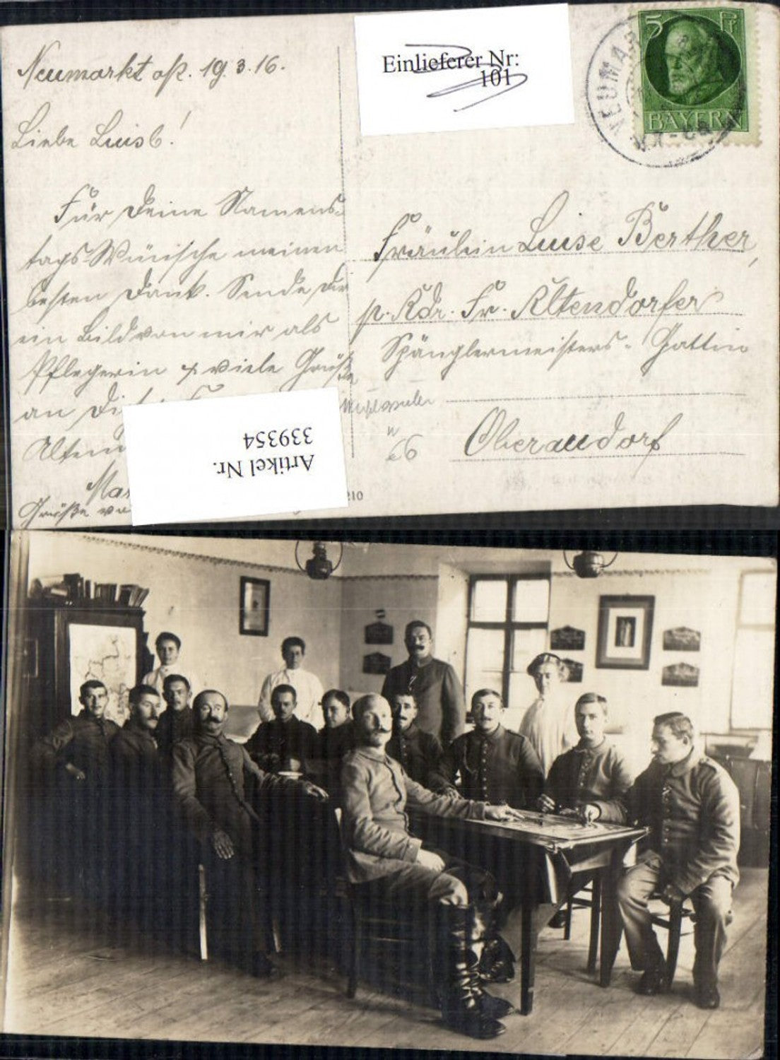 339354,Foto Ak WW1 Soldaten Uniform b. Tisch Rauchen Spielen Würfelspiel Neumarkt Oberpfalz
