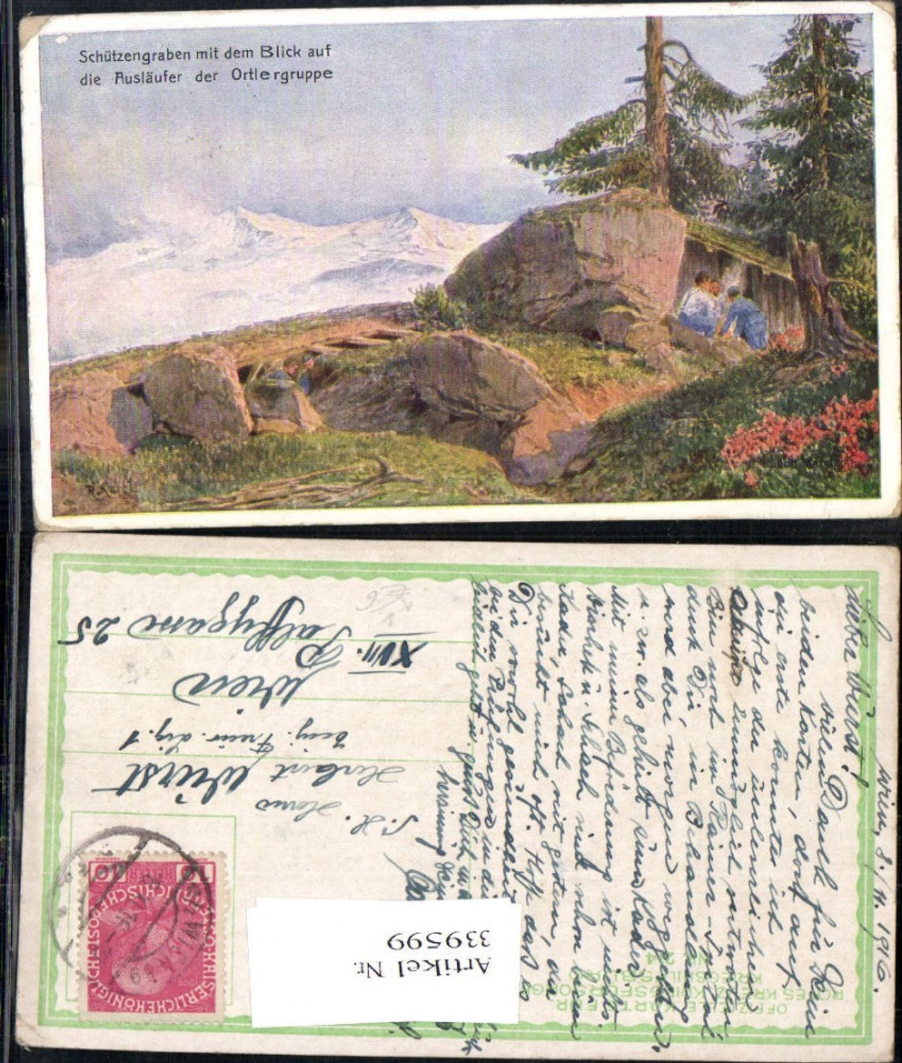 339599,Künstler Ak R. Karel WW1 Schützengraben Blick a. Ausläufer Ortlergruppe pub Kriegsfürsorge 214
