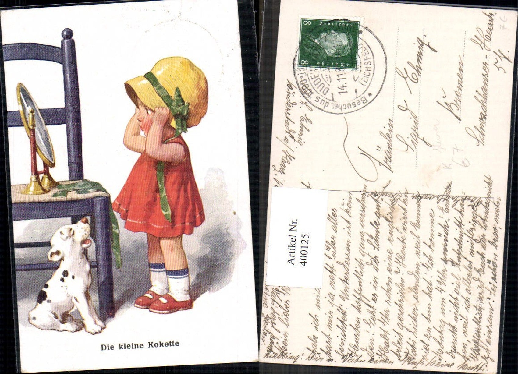 400125,Künstler Ak Mädchen schaut i. Spiegel Hut Hund Die kleine Kokotte Scherz Humor