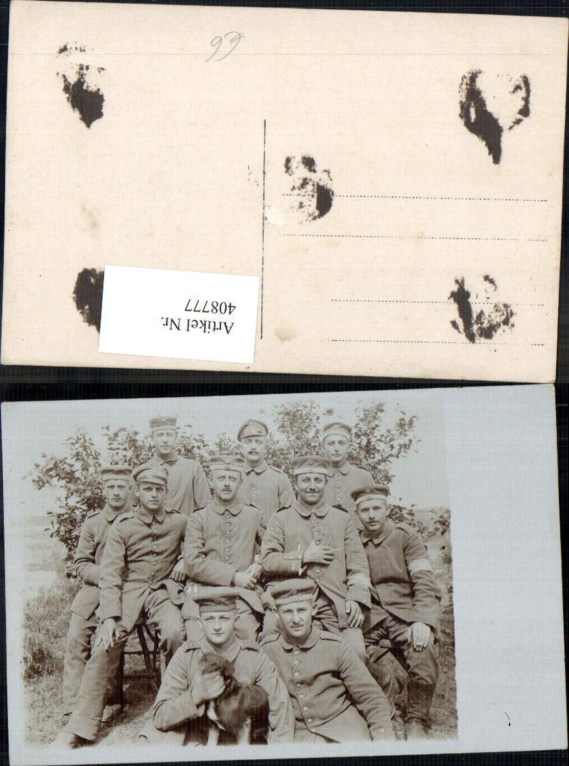 408777,Foto Ak WW1 Gruppenbild Soldaten Uniformen Hund Rauchen