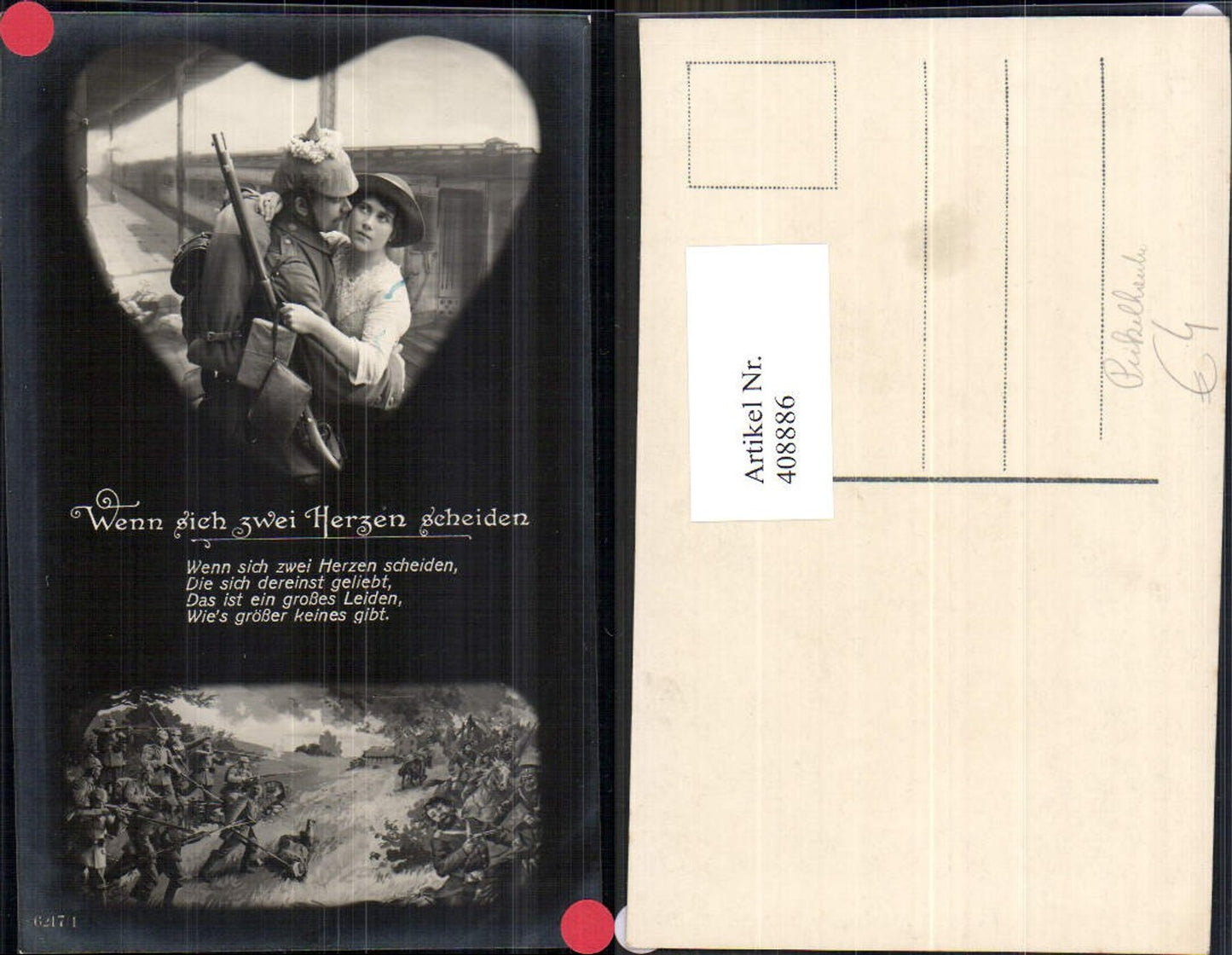 408886,Fotomontage WW1 Soldat Pickelhaube Kuss Frau Zug Eisenbahn Schlachtfeld Herz Spruch