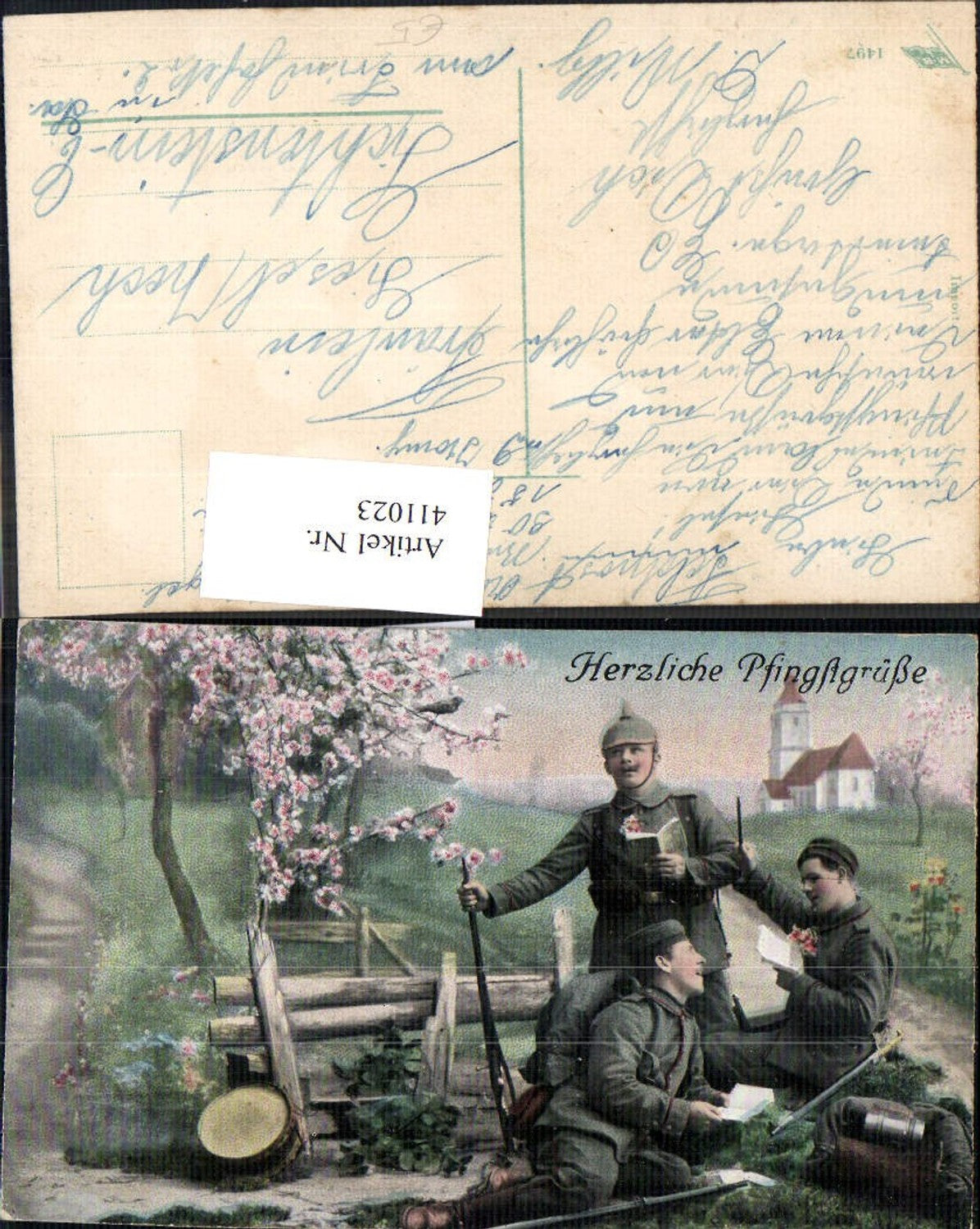 411023,WW1 Soldaten Uniform Trommel Pickelhaube Lesen Briefe Fahne Pfingstgrüße