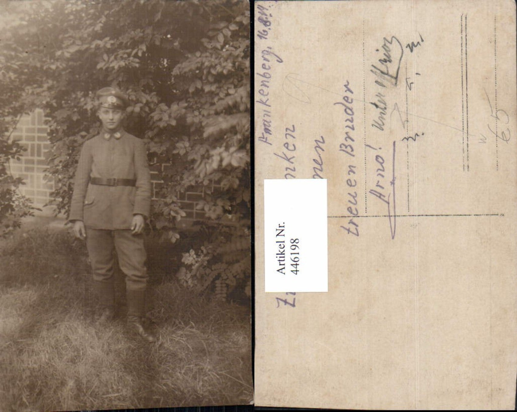 446198,Foto Ak WW1 Soldat Uniform v. Gebäude Frankenberg