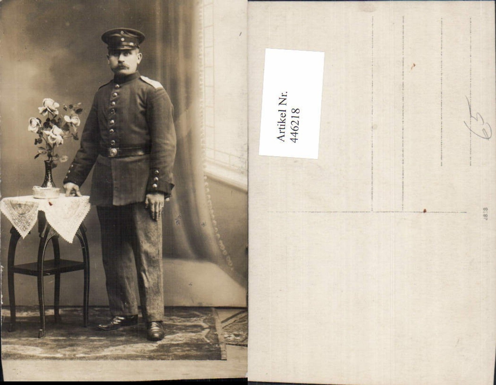 446218,Foto Ak WW1 Soldat Uniform b. Tisch stehend