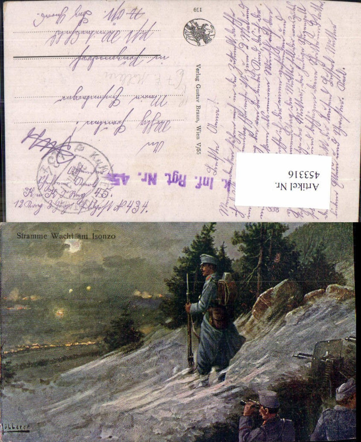 453316,Künstler Ak F. Höllerer WW1 Stramme Wacht a. Isonzo FP Inf. Reg. 45