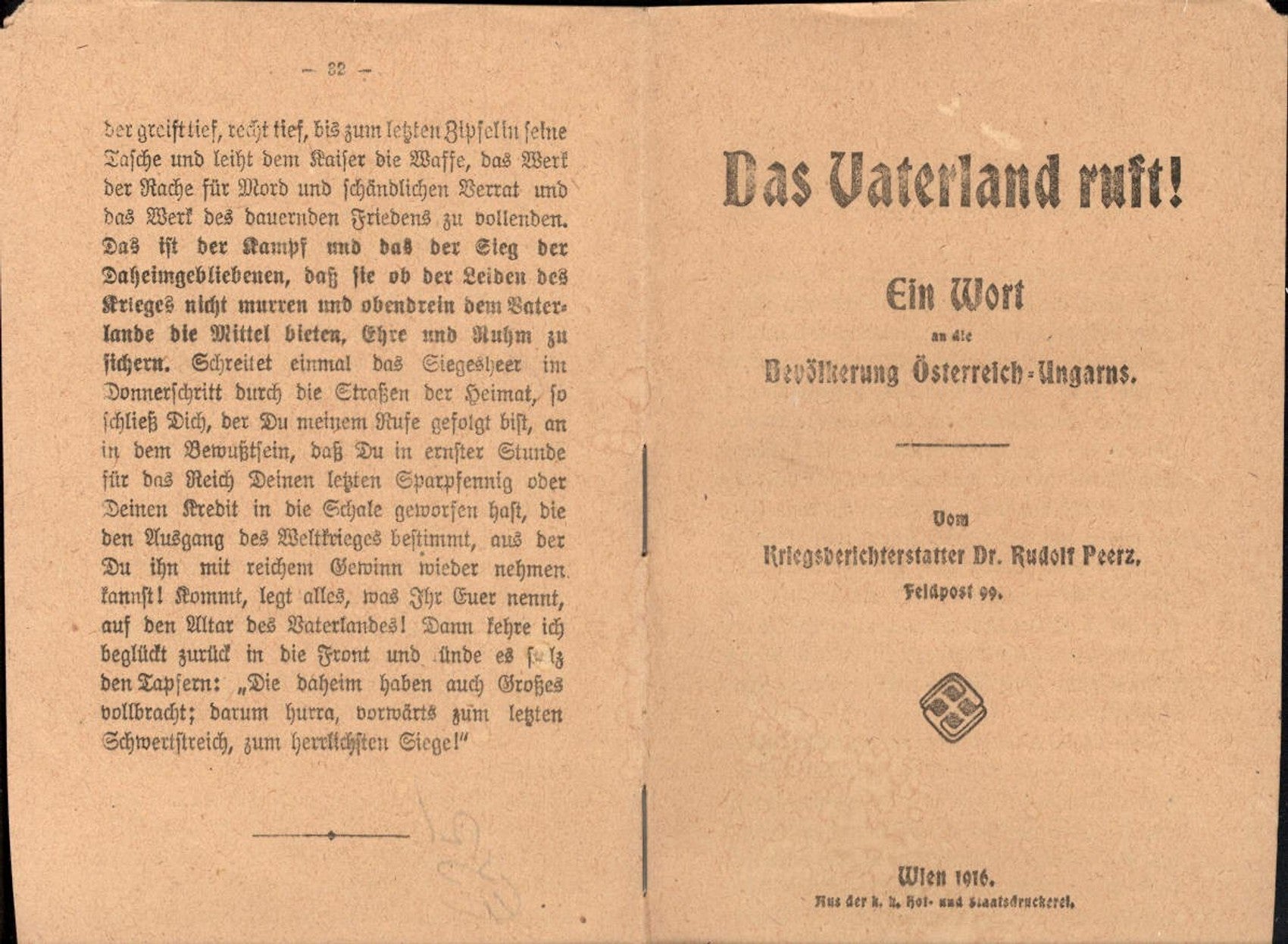 499456,Büchlein WW1 Das Vaterland ruft Kriegsberichterstatter Dr. Rudolf Peerz Feldpost 99