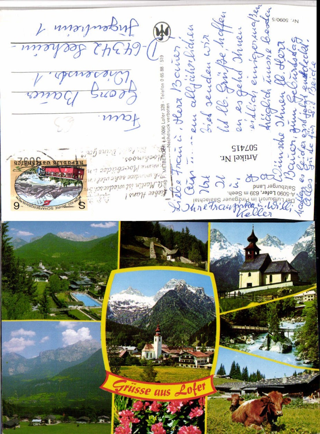 507415,Lofer Totale Kirche Freibad Rinder Mehrbildkarte