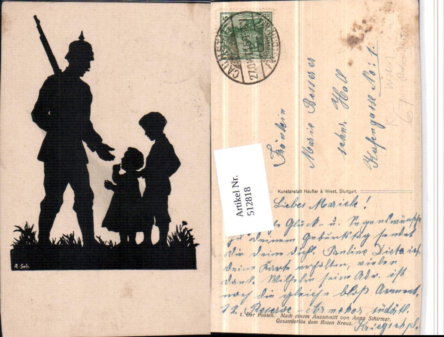 512818,Künstler AK Scherenschnitt Anna Schirmer WW1 Soldat Kinder Rotes Kreuz