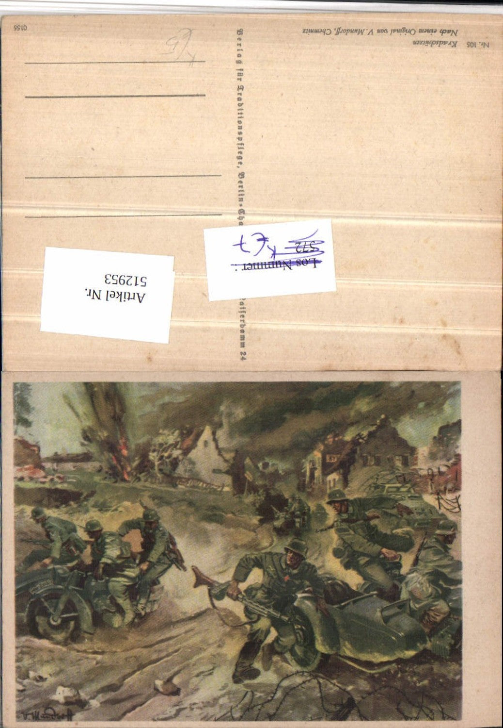 512953,Künstler AK V. Mundorff WW2 Wehrmacht Kradschützen Schlacht