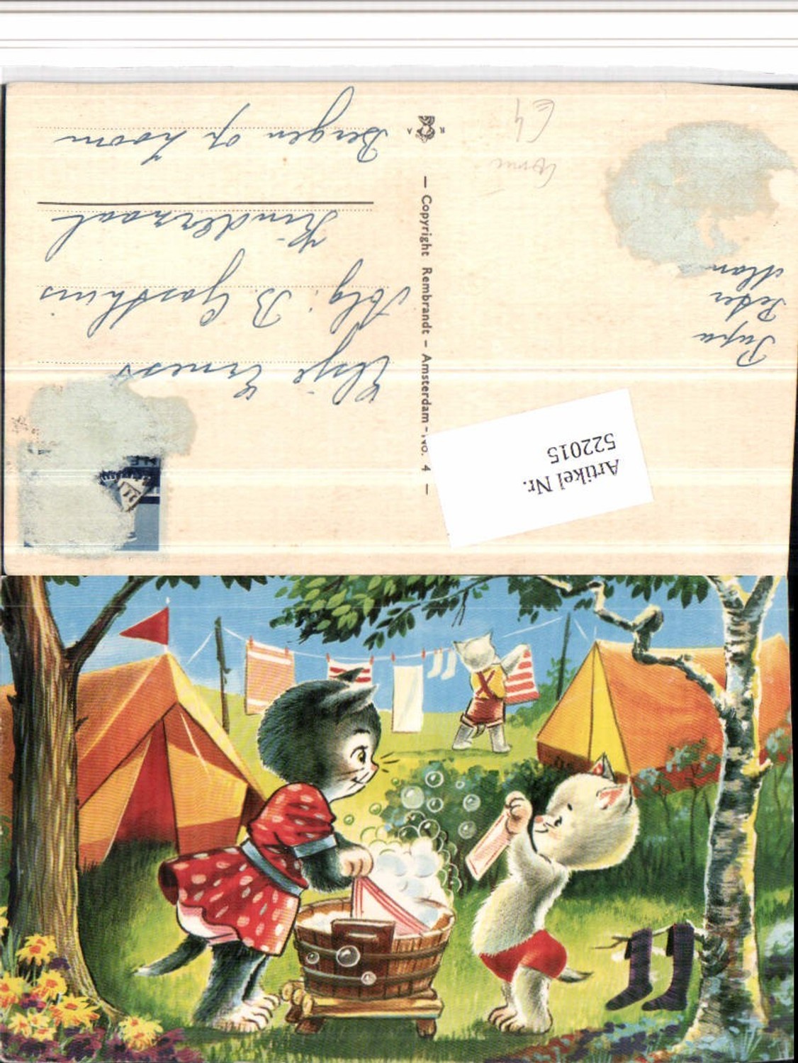 522015,Künstler AK Comic Katzen vermenschlicht Wäsche waschen