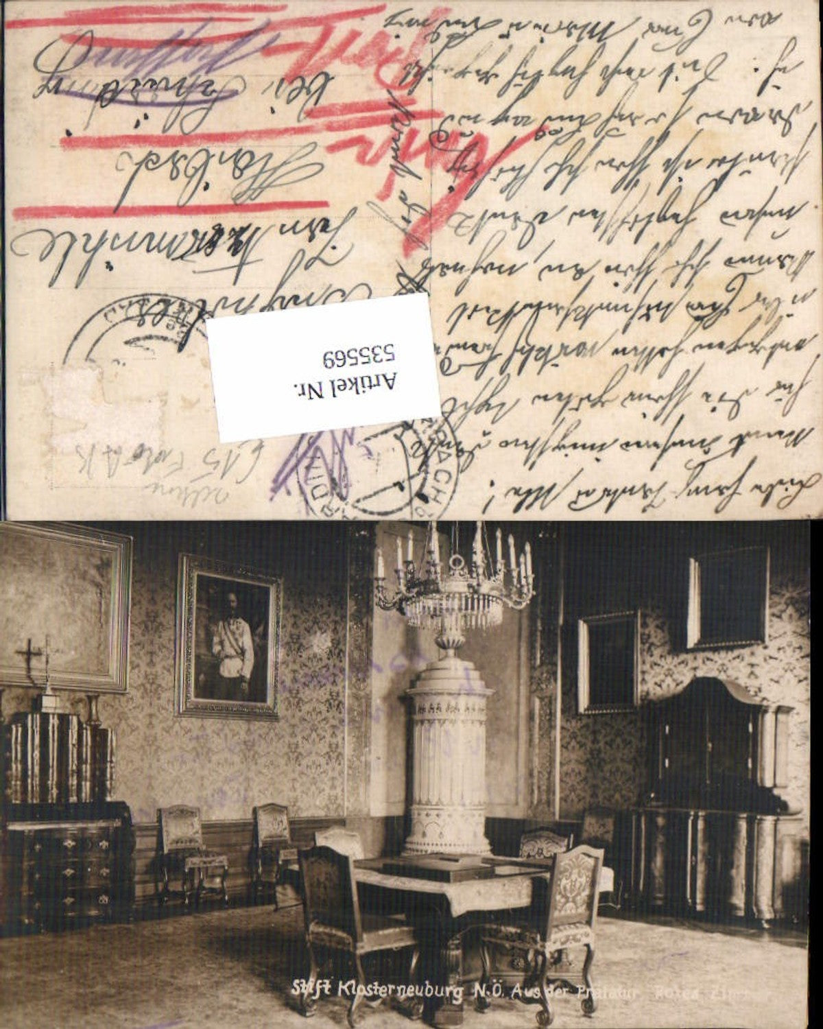 535569,seltene Foto-AK Korneuburg Prälaur Rokea Zimmer Ofen Luster Kachelofen