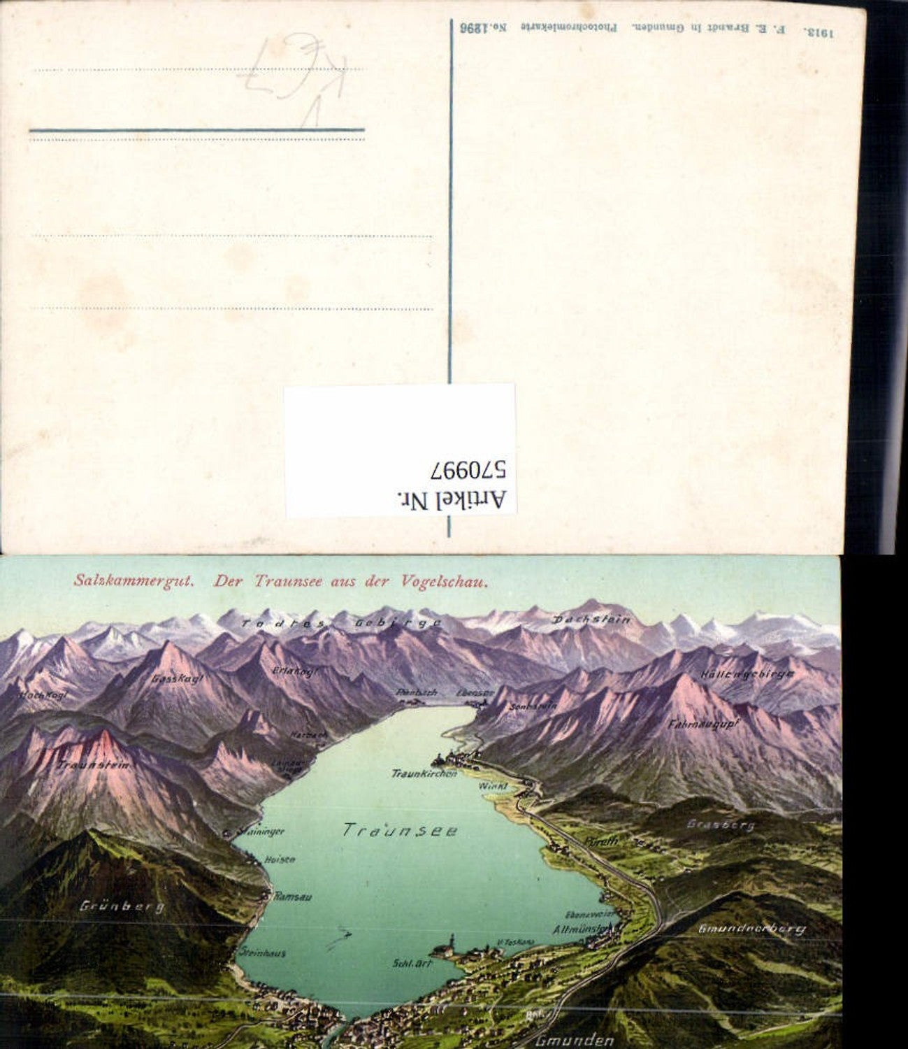 570997,Künstler Ak Lagekarte Salzkammergut Traunsee v. d. Vogelschau Gmunden Traunkirchen pub F. E. Brandt 1296