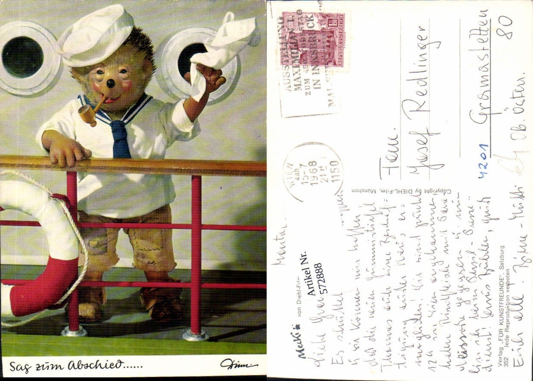 572888,Mecki 352 Igel als Matrose winkt Sag zum Abschied