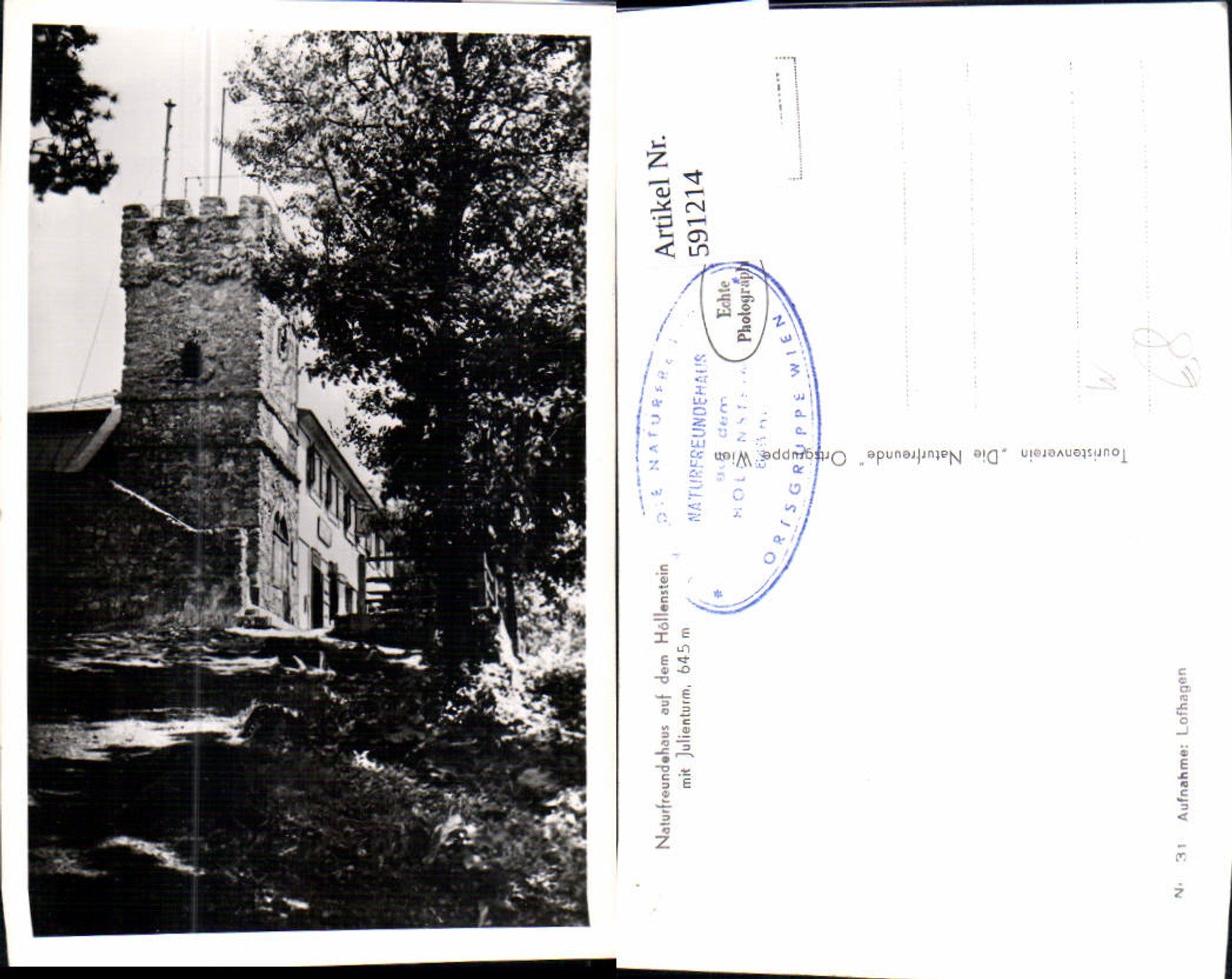 591214,Foto Ak Naturfreundehaus a. d. Höllenstein m. Julienturm Kaltenleutgeben