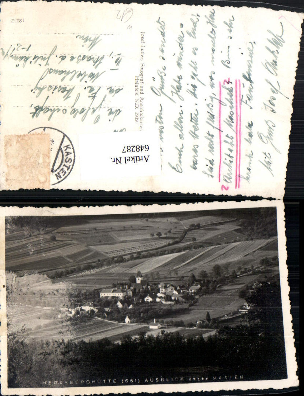 648287,Foto Ak Hegerberghütte Ausblick geg. Kasten bei Böheimkirchen