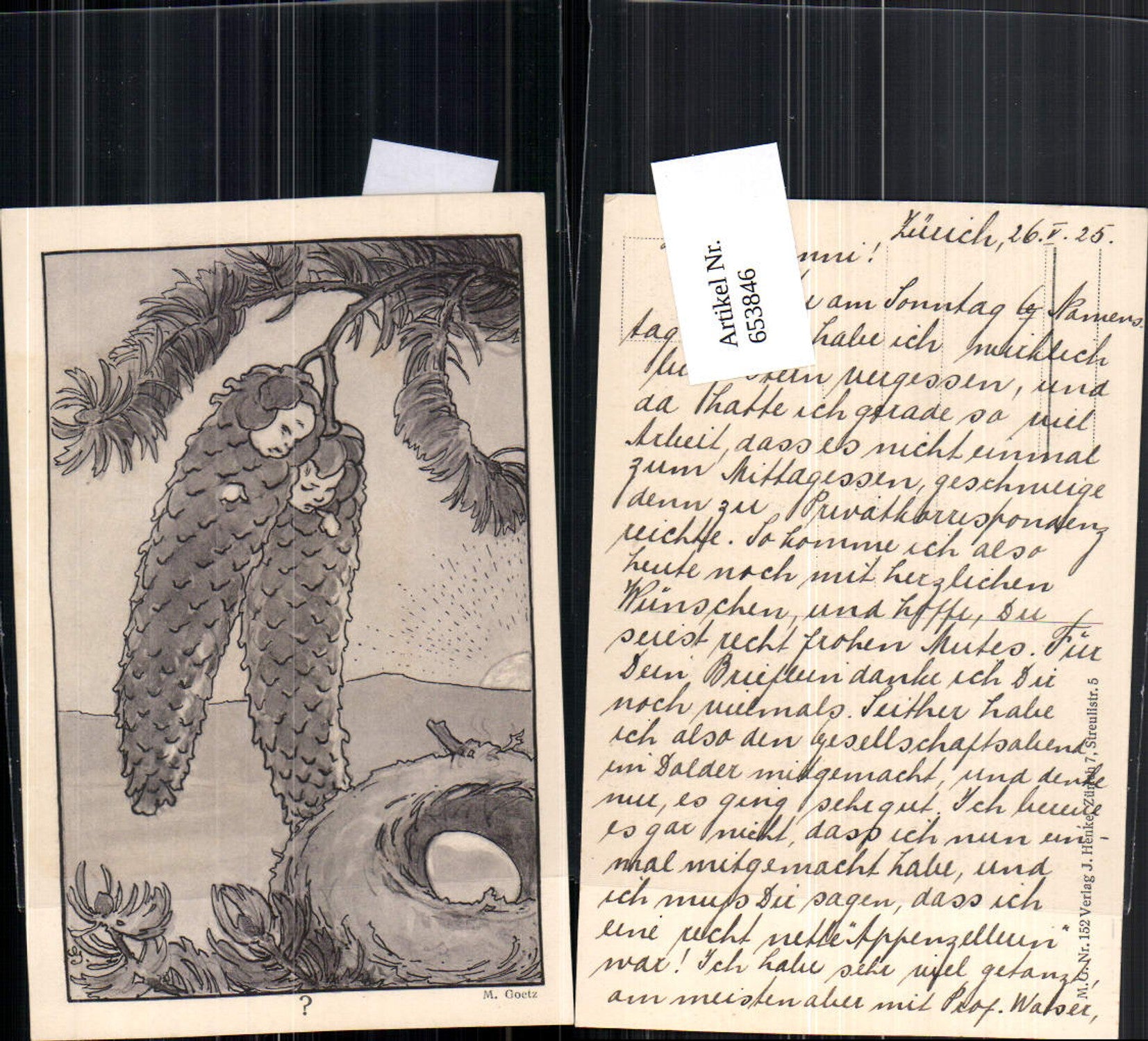 653846,Künstler AK M. Goetz Tannenzapfen vermenschlicht Metamorphose