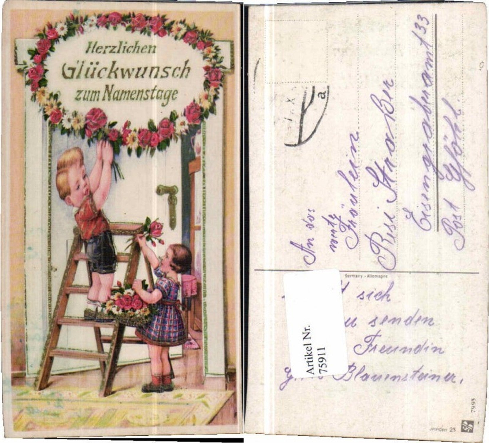 75911,Namenstag Süsse Kinder schmücken Tür m. Blumen Leiter